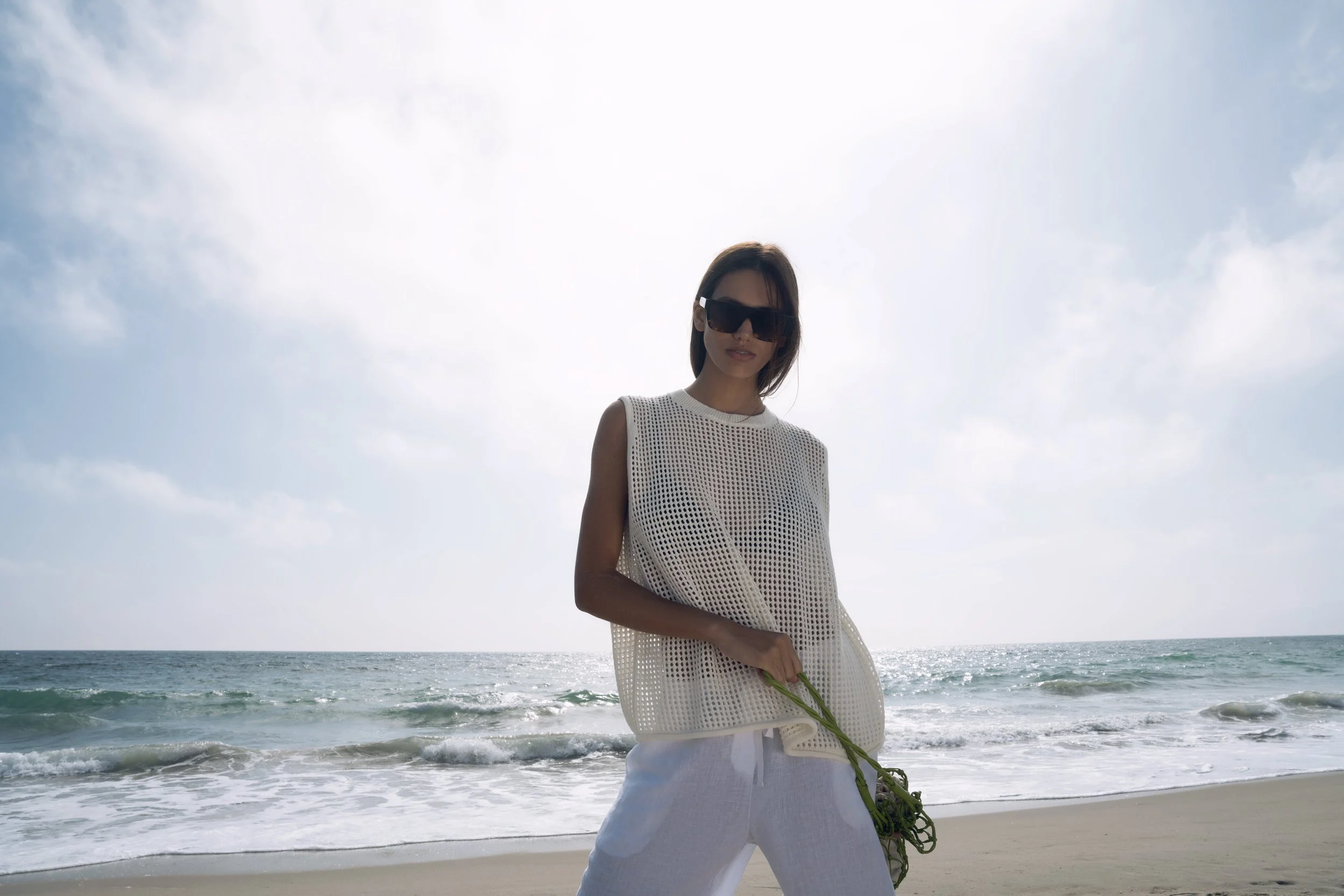 A woman in a white sleeveless top and white pants standing on a beach with the ocean in the background, wearing sunglasses and holding some green plants.