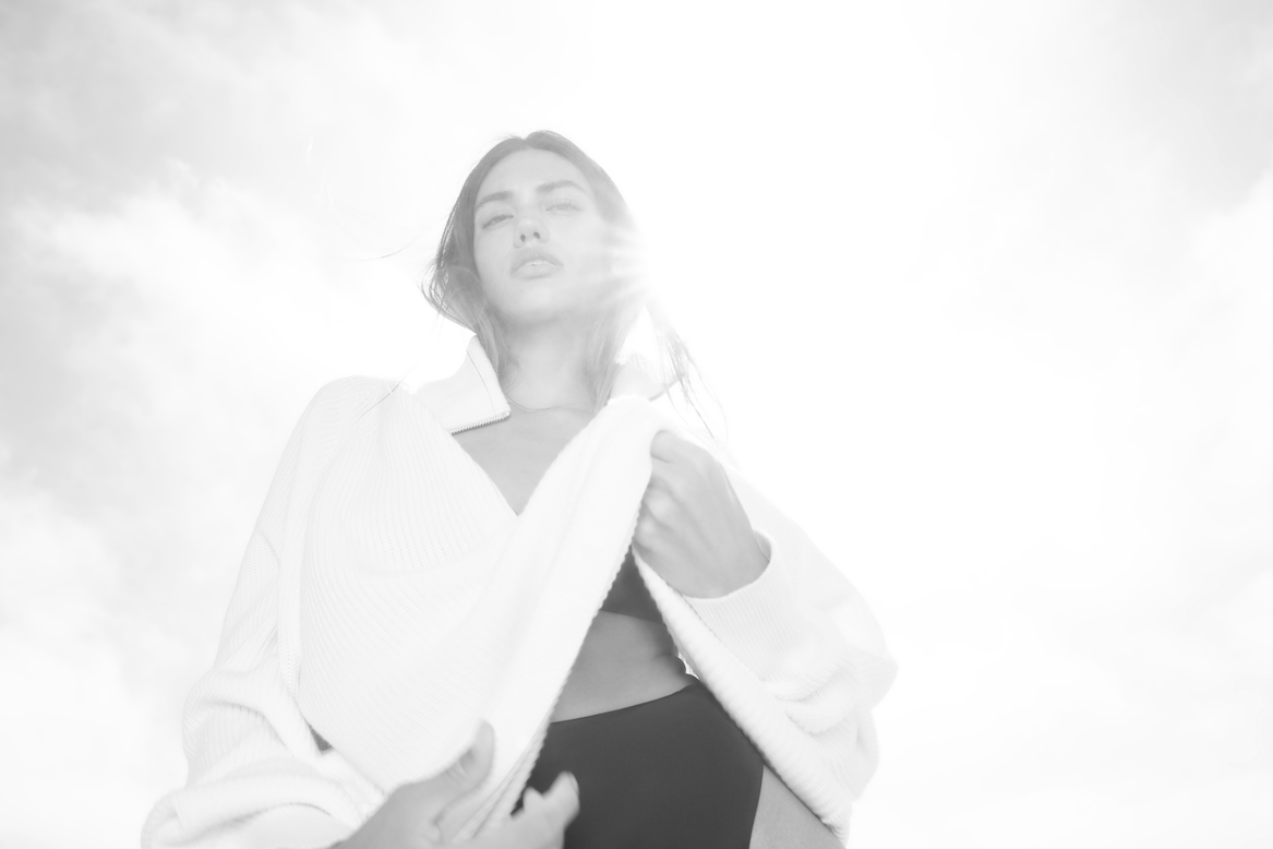 Young woman sitting on a chair on the beach, wearing a cream sweater and black swimsuit, with her arms raised above her head, looking at the camera with the ocean in the background.