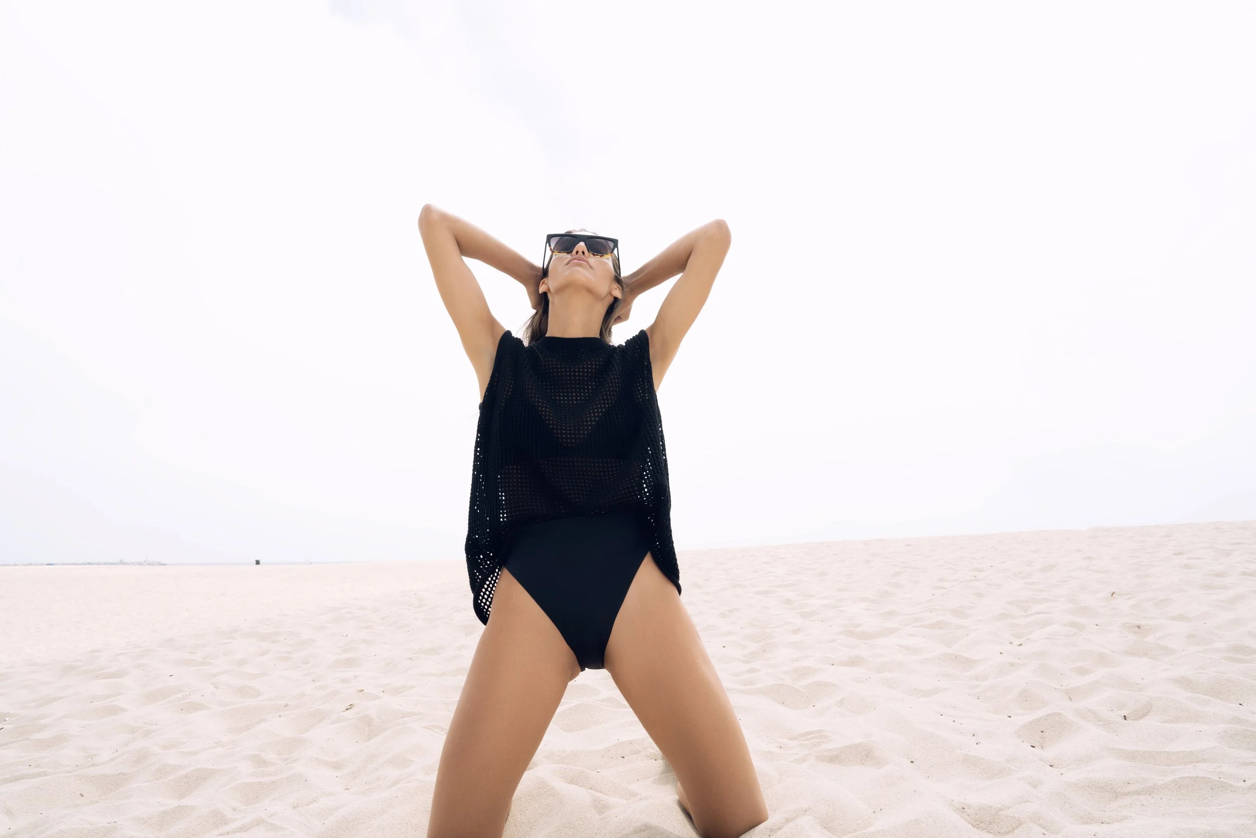 A woman in black swimwear and sunglasses kneeling on a sandy beach with her arms behind her head, looking up at the sky.