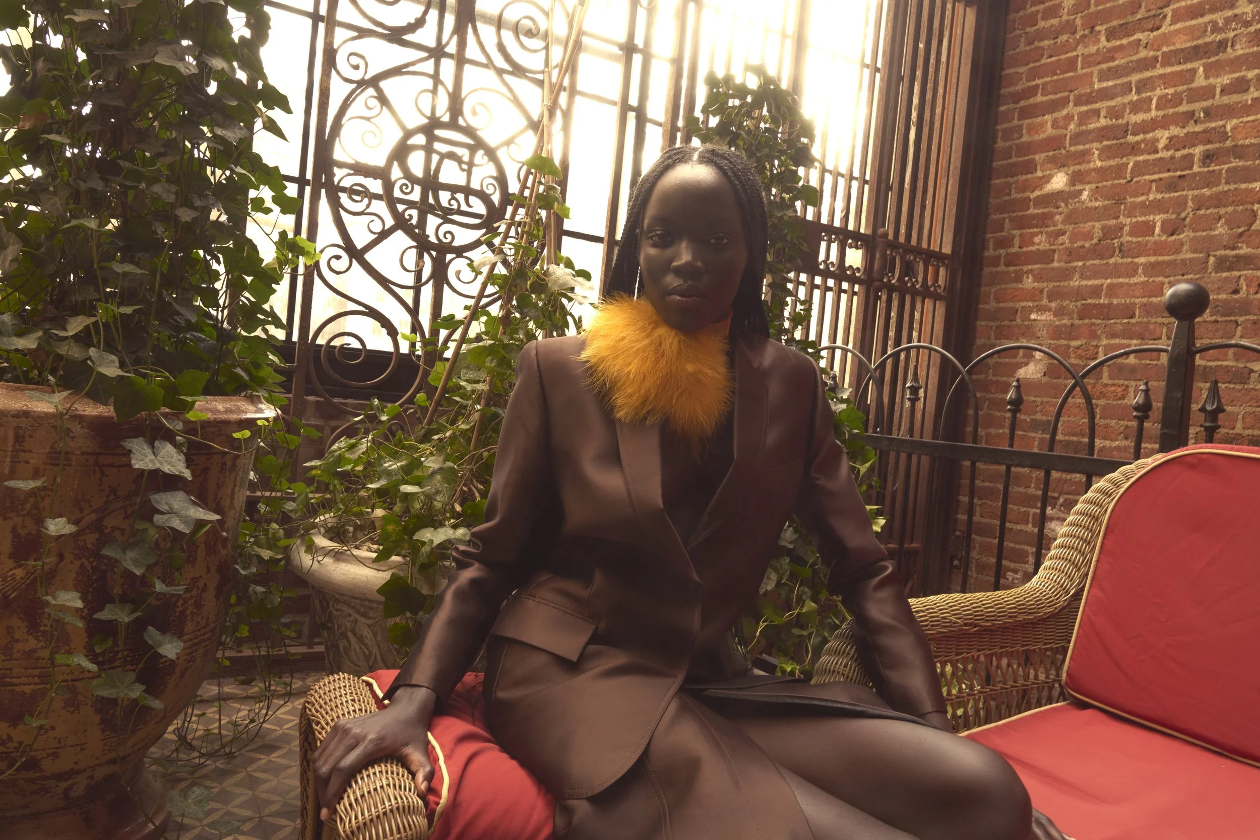 A woman with dark skin and braided hair sitting on a wicker chair in a sunlit indoor space with brick walls and greenery. She is wearing a brown blazer with an orange fur collar.
