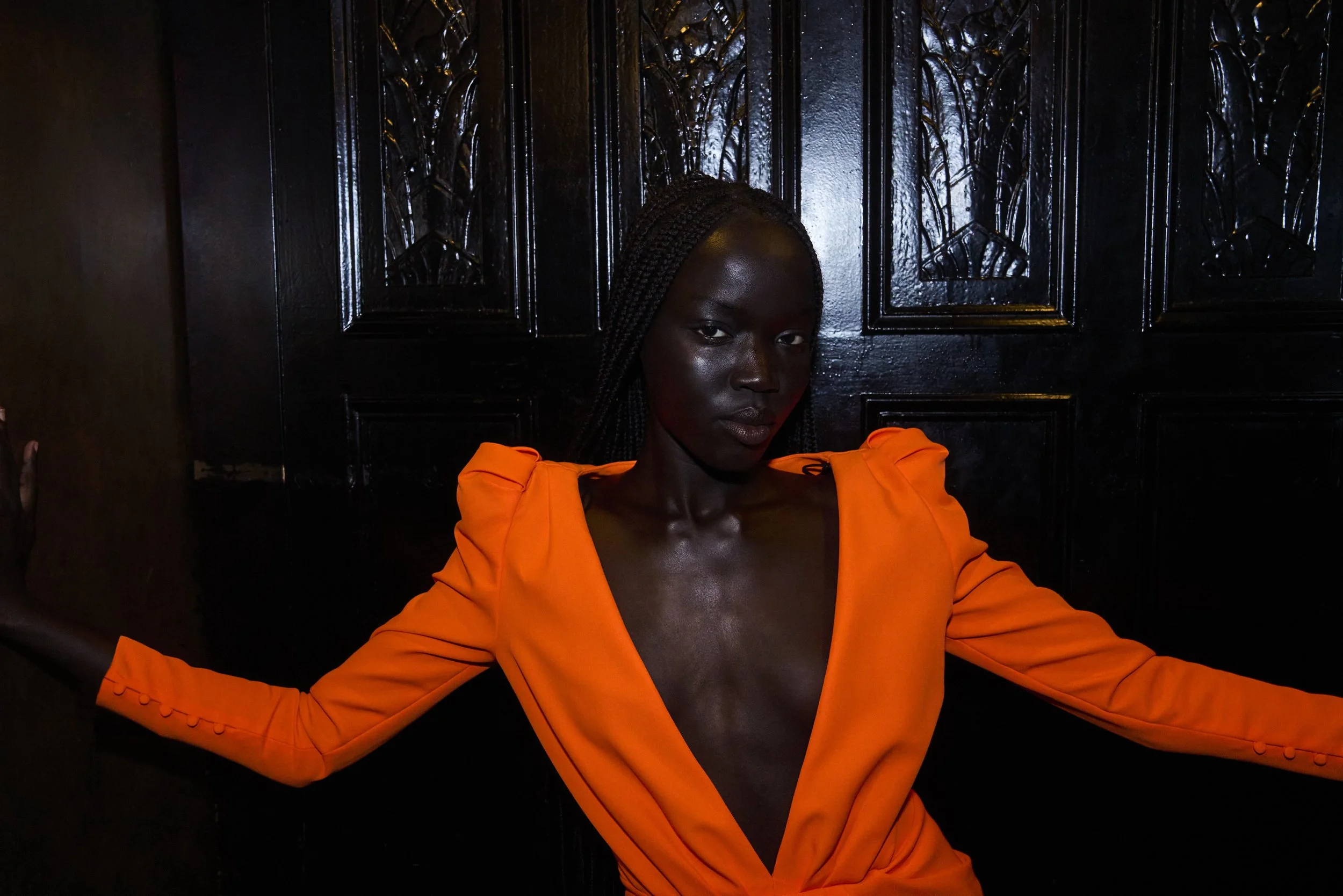 A woman with dark skin and braided hair in an orange dress sits against a black background, looking directly at the camera.
